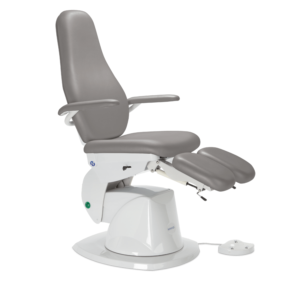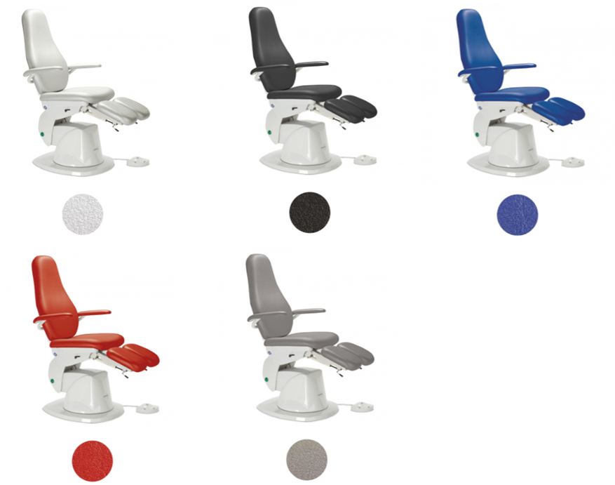 Pedikīra krēsls ar 1 motoru – elektriski regulējams sēdekļa augstums (sinhronizēts ar sēdekļa slīpumu). Manuāla atzveltnes regulēšana ar gāzes atsperi. Polsterēti roku balsti, salokās neatkarīgi. Dalāms, izvelkams kāju balsts, regulējams 90 grādu leņķī, ar sānu atvēršanu. 360 grādu rotācija, pretapgāšanās sistēma. Asinsizturīga mākslīgās ādas apdare. Pieejamas 5 apšuvuma krāsas.