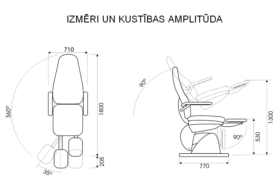 - Maksimālais krēsla slīpuma leņķis: 90°