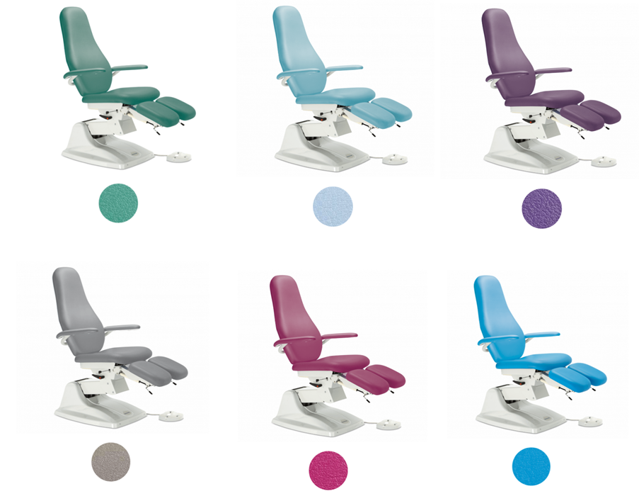 Pedikīra krēsls ar 1 motoru – elektriski regulējams sēdekļa augstums (sinhronizēts ar sēdekļa slīpumu). Manuāla atzveltnes regulēšana ar gāzes atsperi. Ergonomiski roku balsti, neatkarīgi izvelkami. Dalāms, izvelkams kāju balsts (regulējams 90 grādu leņķī), ar sānu atvēršanu, pacelšanas un nolaišanas sistēmu, ko kontrolē virzulis. 140 grādu rotācija, pretapgāšanās sistēma. Asinsizturīga mākslīgās ādas apdare. Pieejamas 6 apšuvuma krāsas.
