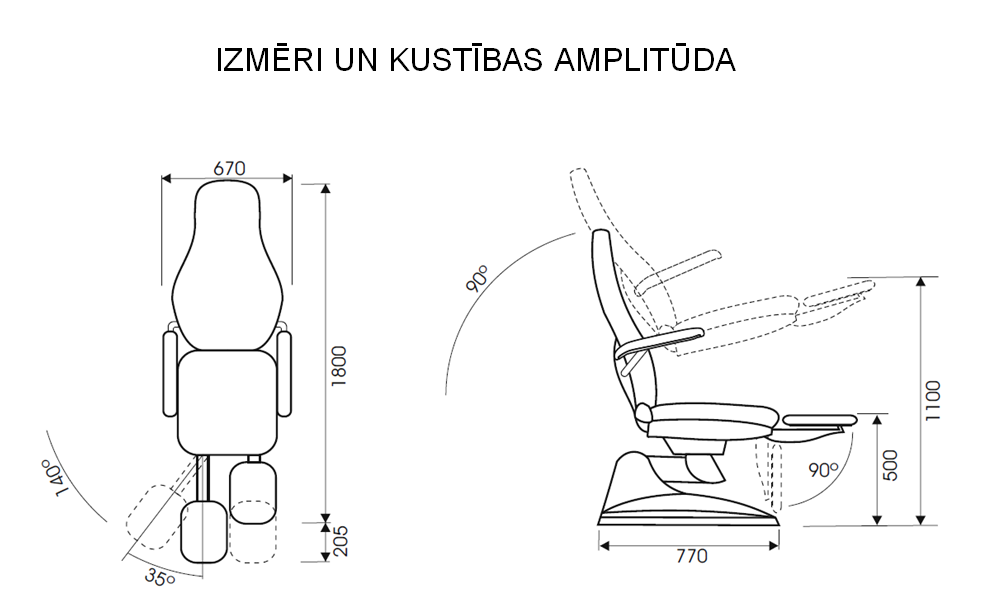 - Maksimālais krēsla slīpuma leņķis: 90°